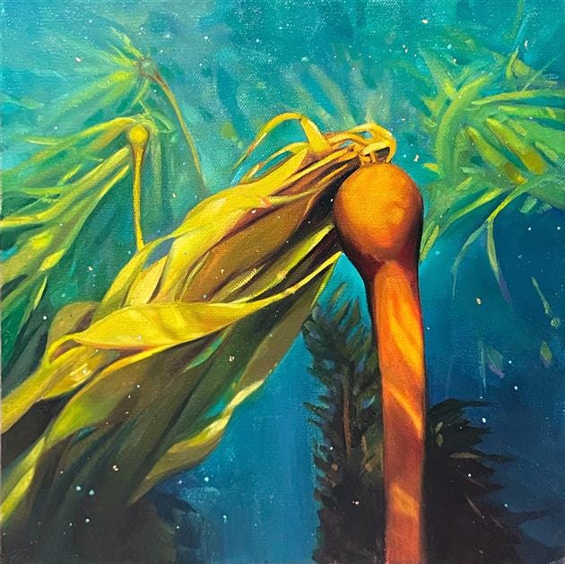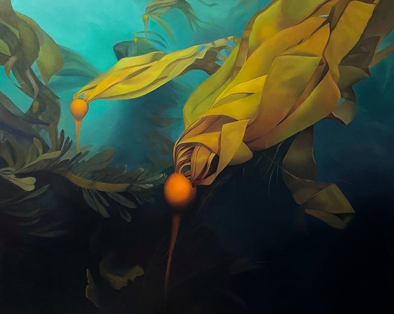 Novack is adept at creating spatial depth, a technique that gently pulls us into the flow of the blue, black, and turquoise-colored currents, notably in Steadfast, Light and Love, and Salt of the Earth. In Steadfast, the spatial depth is accented by three orange-yellow seaweed air bladders placed in painted space. The orange-scarlet in the foreground shifts to yellow-ochre in the background. These orange lights serve as beacons, guiding us through the underworld. I can’t help but draw the analogy that, just as these air-filled beacons are underwater landmarks, we humans, filled with water, serve as anchors in our airy realm.
