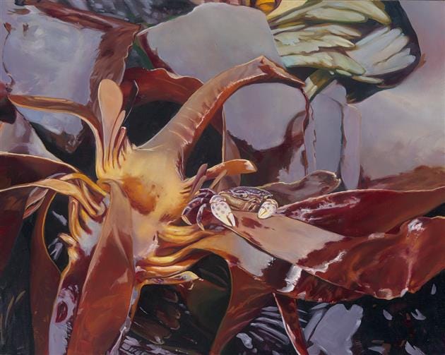 On a purely technical view, I'm impressed by how effortlessly she paints form. Notice in Light and Love the ribbons of the fronds, and how they have gentle, curvy shapes that bend and fold to the current and to the light.